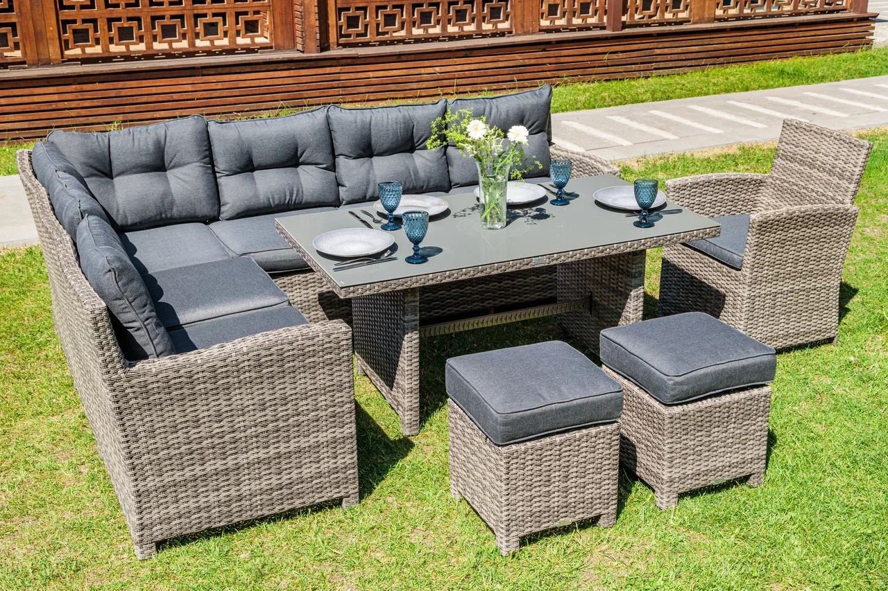 зысканный дизайн в вещах, которые предназначены для зоны комфорта и отдыха – всё это про набор мебели Genry. Данный комплект мебели предназначен для установки на улице и в помещении, и может использоваться в температурном диапазоне от -30 до +50 градусов. В состав входит угловой диван размером 251х85х205 см, кресло 58х89х60 см, и два пуфа 40х38х40 см.