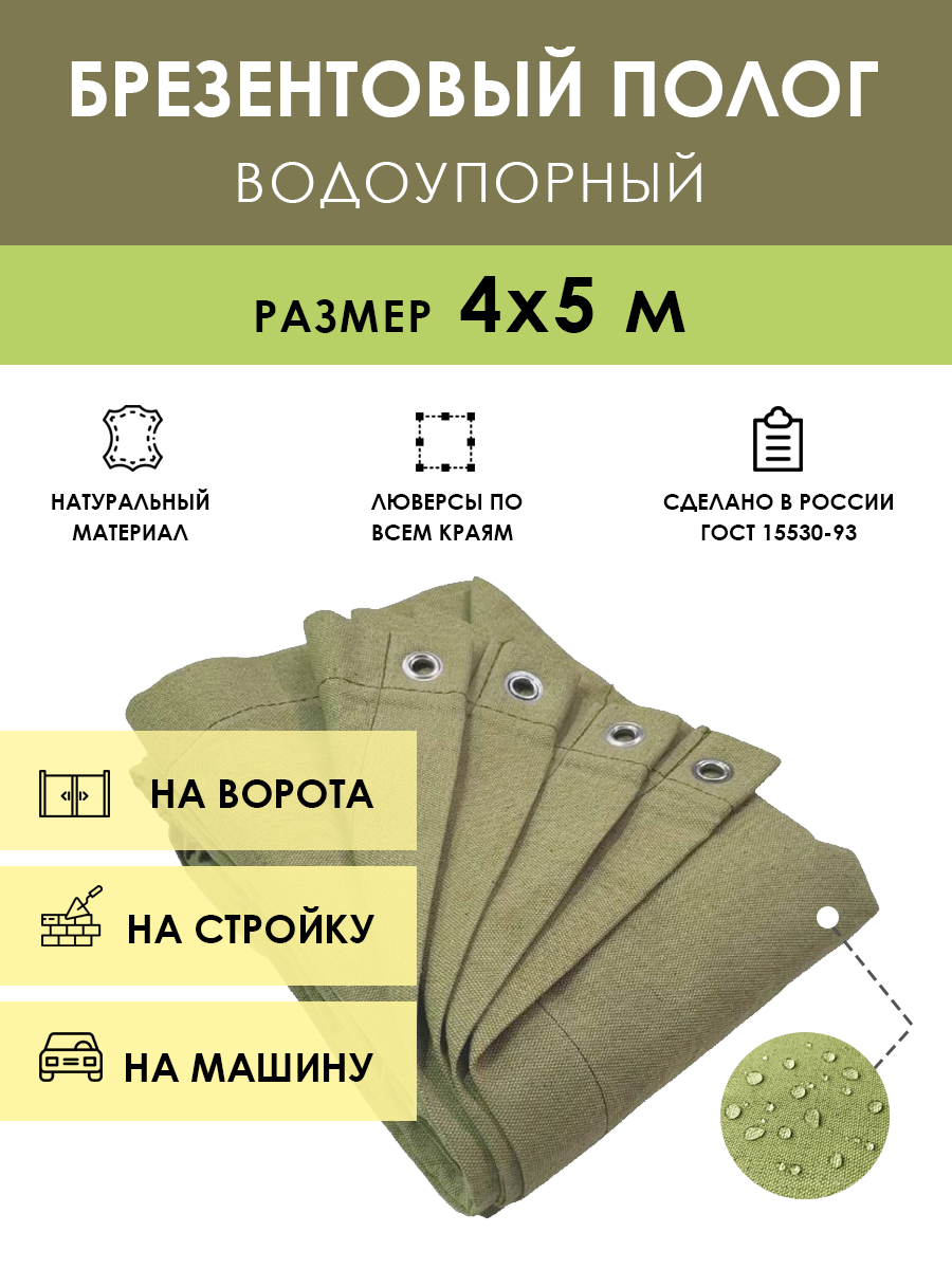 Мы хотим предложить вам купить водоупорный брезентовый полог размером 4 х 5 м, это стандартный полог, который оснащён люверсами, имеющими шаг 0,5 м. На заказ шаг люверсов может быть любым. Сшит такой полог при помощи очень прочных лавсановых нитей, а его водоупорность составляет 100 мм водного столба. Выполнен в цвете хаки, может иметь разные оттенки, он имеет водоупорную пропитку. В составе данного материала лен и хлопок. Такой брезент - это качественное полотно, сделанное из толстой пряжи. Такой тканый материал имеет высокую прочность. Брезентовая ткань отличается износостойкостью, она не промокает, не пропускает через себя воду даже при сильных осадках. Также она не деформируется от загрязнений и изменений температуры.